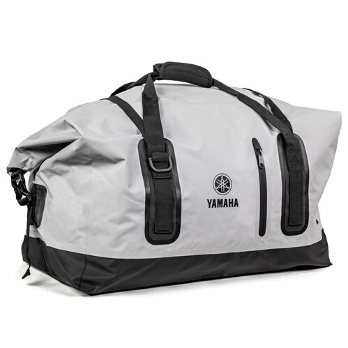 Roll-top closure ensures waterproof seal with a horizontal design. Features front zippered pocket for additional storage, compression straps, tie downs around the body, top padded handles and adjustable removable strap.