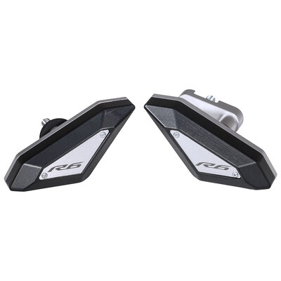 Protectors placed on either side of the bike to prevent damage to the frame and bodywork in the event of an accident tip over. Slim design with an angular, geometric shape for a very modern, stylish look - not like your usual round-style puck Brushed aluminum insert with laser etched R6 logo Clear anodized billet aluminum mounting brac...