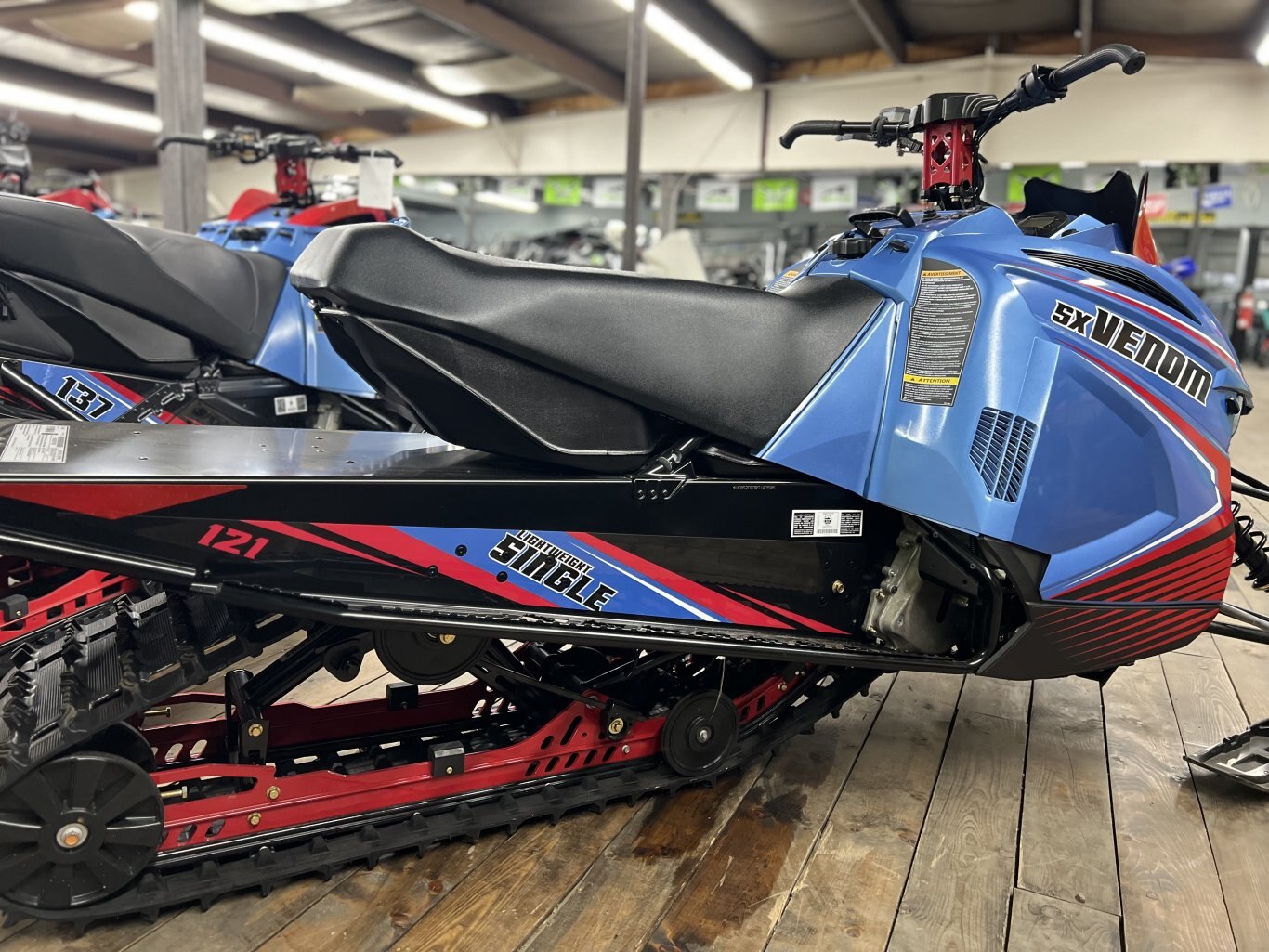 The Venom is a lightweight snowmobile aimed at young, new and returning riders. The fuel-injected, two-stroke 397cc single-cylinder engine features electric start and is propelled by a 121-inch Camso Hacksaw track. Long-travel 'Dual Shock' rear suspension, lightweight alloy chassis, Stryke single keel ski and racy styling combine to create a compact sled that bristles with excitement at a very attractive price.
